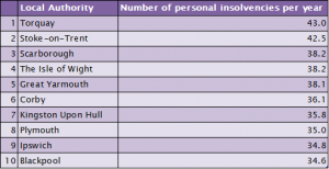 The top spot out of 348 towns for personal bankruptcies was Torquay, with 43 insolvencies per 10,000 population, compared with national average of 19.7. Other high insolvency coastal areas include Scarborough – third worst at 38.2, Hull seventh at 35.8, and Plymouth and Blackpool, eighth and tenth worst respectively at 35 and 34.6.