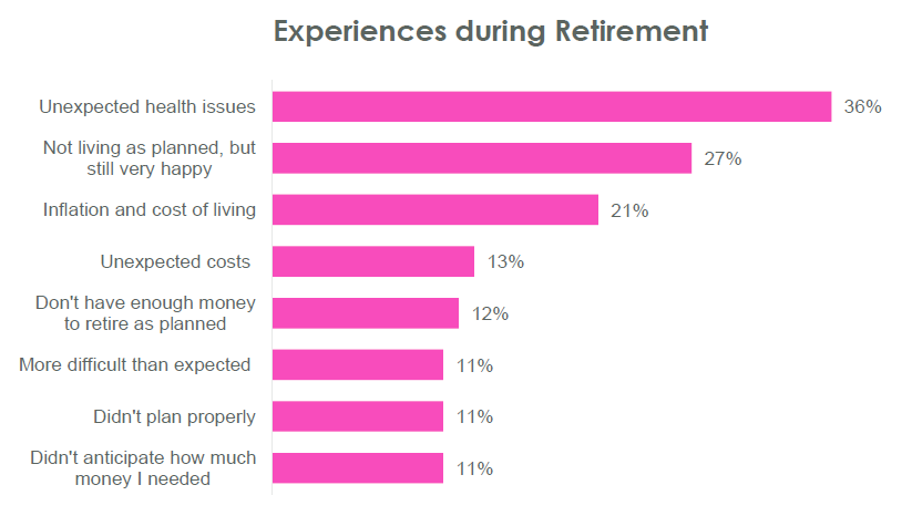 More than a third (36%) of retirees said they had experienced unexpected health challenges, however 27% said that although they weren’t living the retirement they’d planned, they were still very happy.